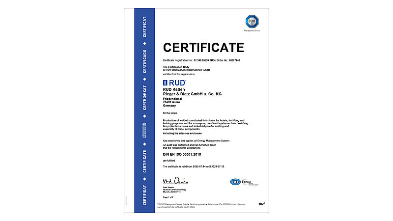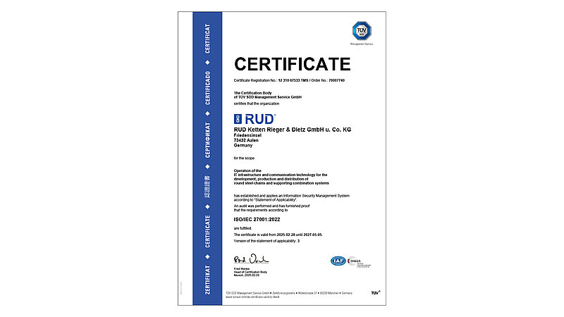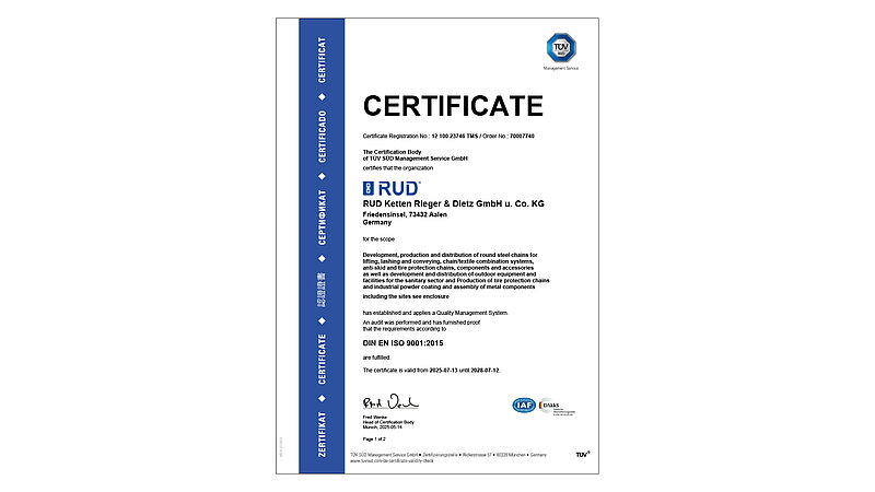 At RUD, quality, safety and responsibility come first. Our products and processes are certified and regularly audited according to international standards. Here you can find all current certificates that demonstrate our high standards in safety, sustainability and manufacturing quality.