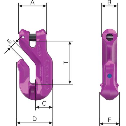 • Verbreiterte Hakenspitze gegen unsachgemäße Anwendung, z. B. falsches Einhängen der Kette.