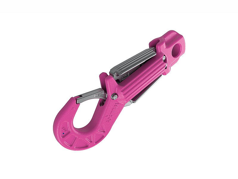 - Der Haken öffnet sich nur, wenn beide Verriegelungsmechanismen gleichzeitig gedrückt werden.